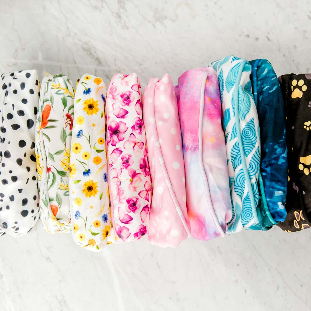 • The full range of Cuddle Bud dog bed covers. L to R - Terrazzo, Australian Beauties, Sunshine on my Mind, You Give me Butterflies, Pink Dots, Dreamy Days, Koalified Cuddler, Shell Yeah and I Love You BEARy Much.