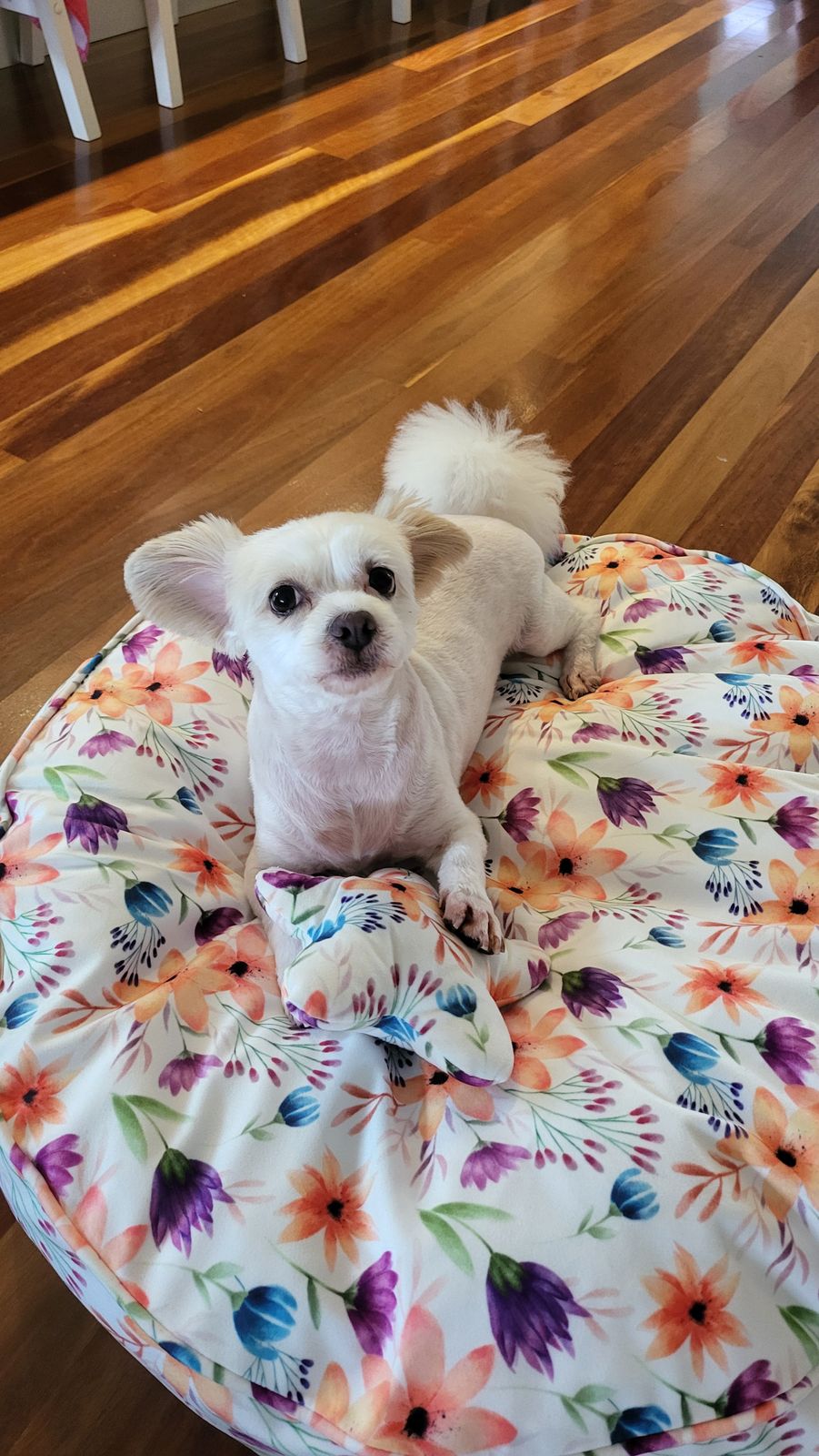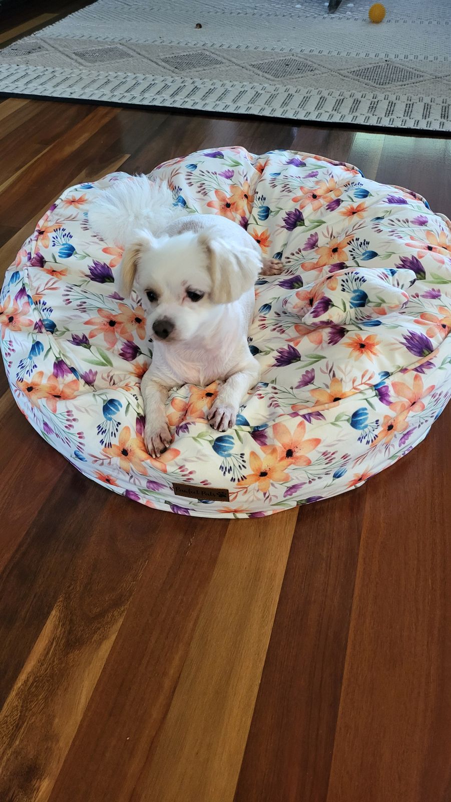 Poppy prefers this bed to the lounge and my bed. We are both extremely happy with that, and I love how pretty it is. Poppy uses the star pillow for cuddles and play.